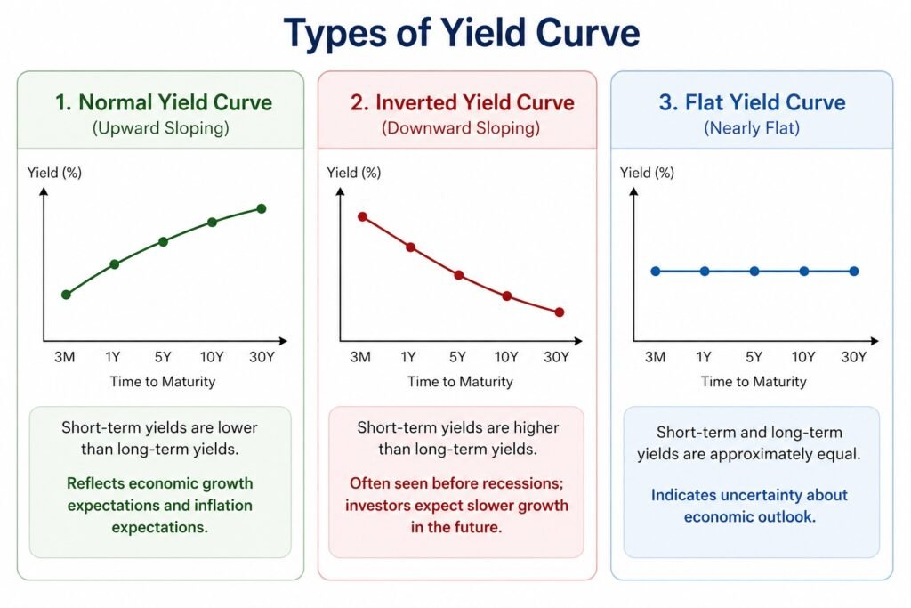 Types of Yield Curve (Normal, Inverted, Flat):